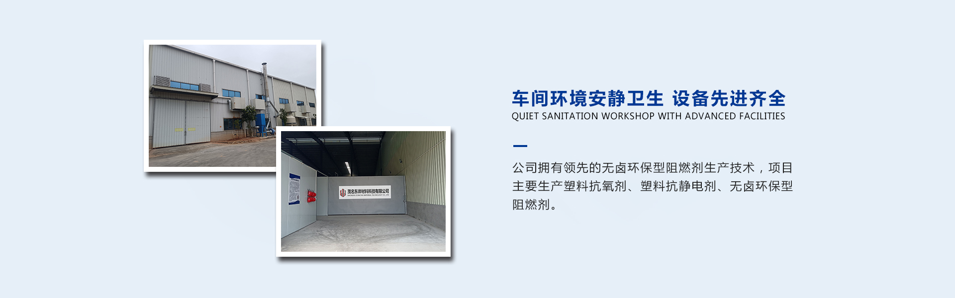 公司擁有先進的無鹵環保型阻燃劑生產技術,項目主要生產塑料抗氧劑、塑料抗靜電劑、無鹵環保型阻燃劑。